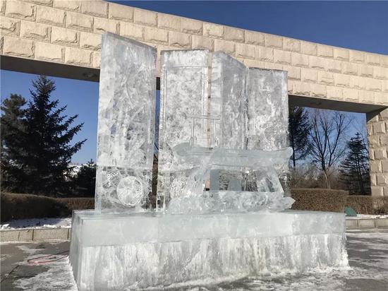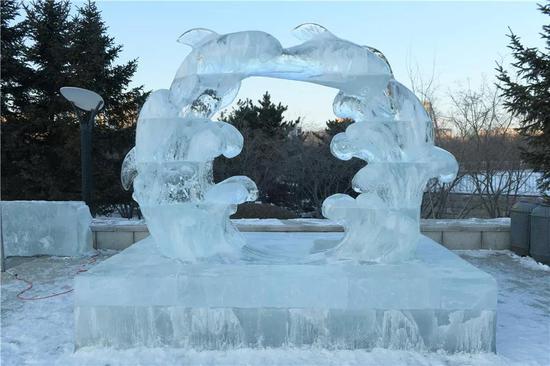 中式的雕刻素材,珊瑚石、孔雀毛、青花瓷瓶、中国画卷轴、假山楼亭,亮点在于各种技法的表现,圆雕、浮雕、镂空等,在国际冰雕的活动中,将中国文化传播到世界。